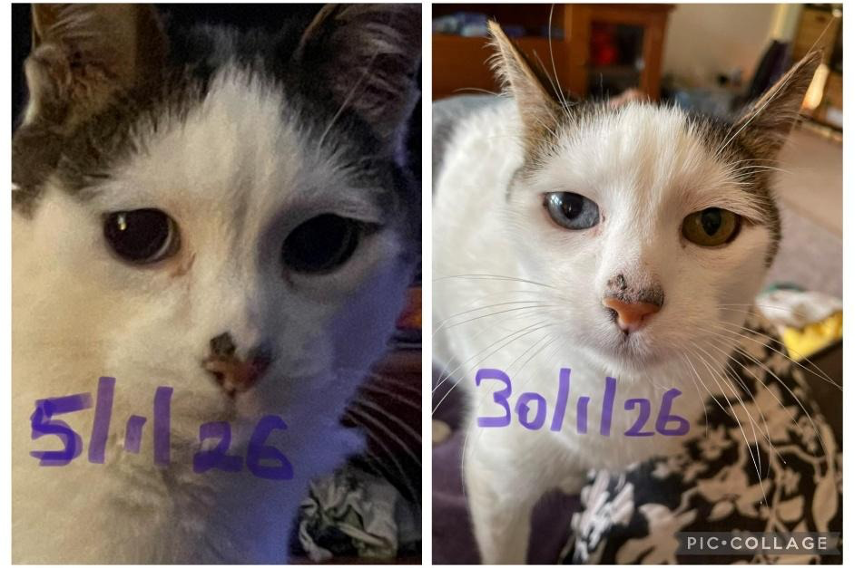 Since using my Oly P90, Sparkles has been coming to sit on my lap regularly to enjoy the frequencies. Last week, I noticed the scab on her nose starting to peel. I left it alone, and it eventually fell off. I took a photo today so you can see the difference — nothing else in her life has changed.