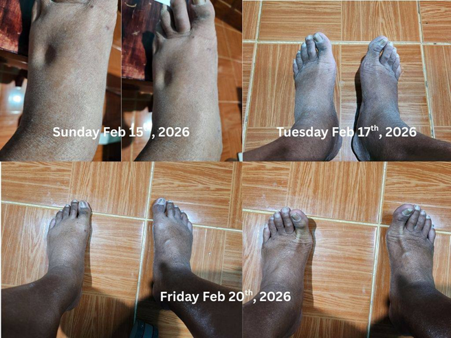 Has edema and the first picture was taken to show how swollen the feet were. The indent was created from pushing my fingers into the foot. 5 days later using p90 plus and swelling mostly gone