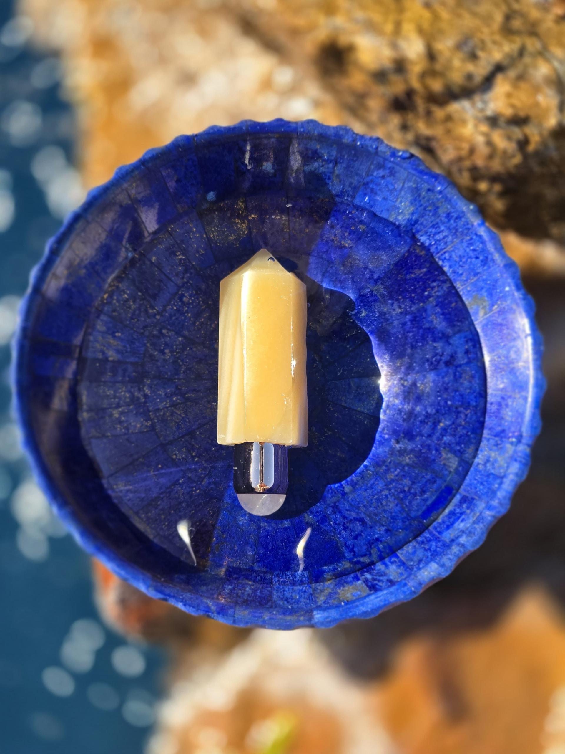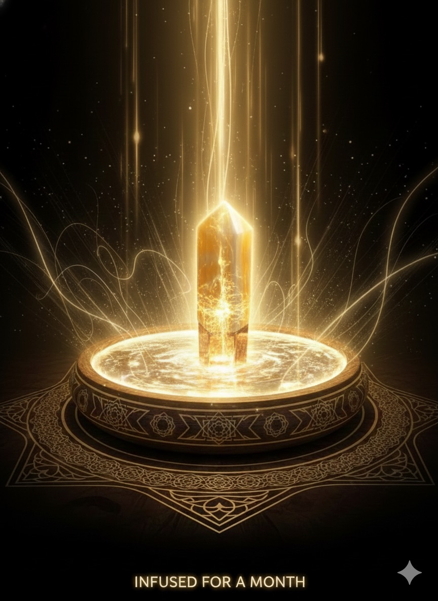 A charged yellow jade crystal bottle paired with a month-long charged perfume, both infused with ancient Sufi healing technology and connected specifically to YOUR energetic signature.